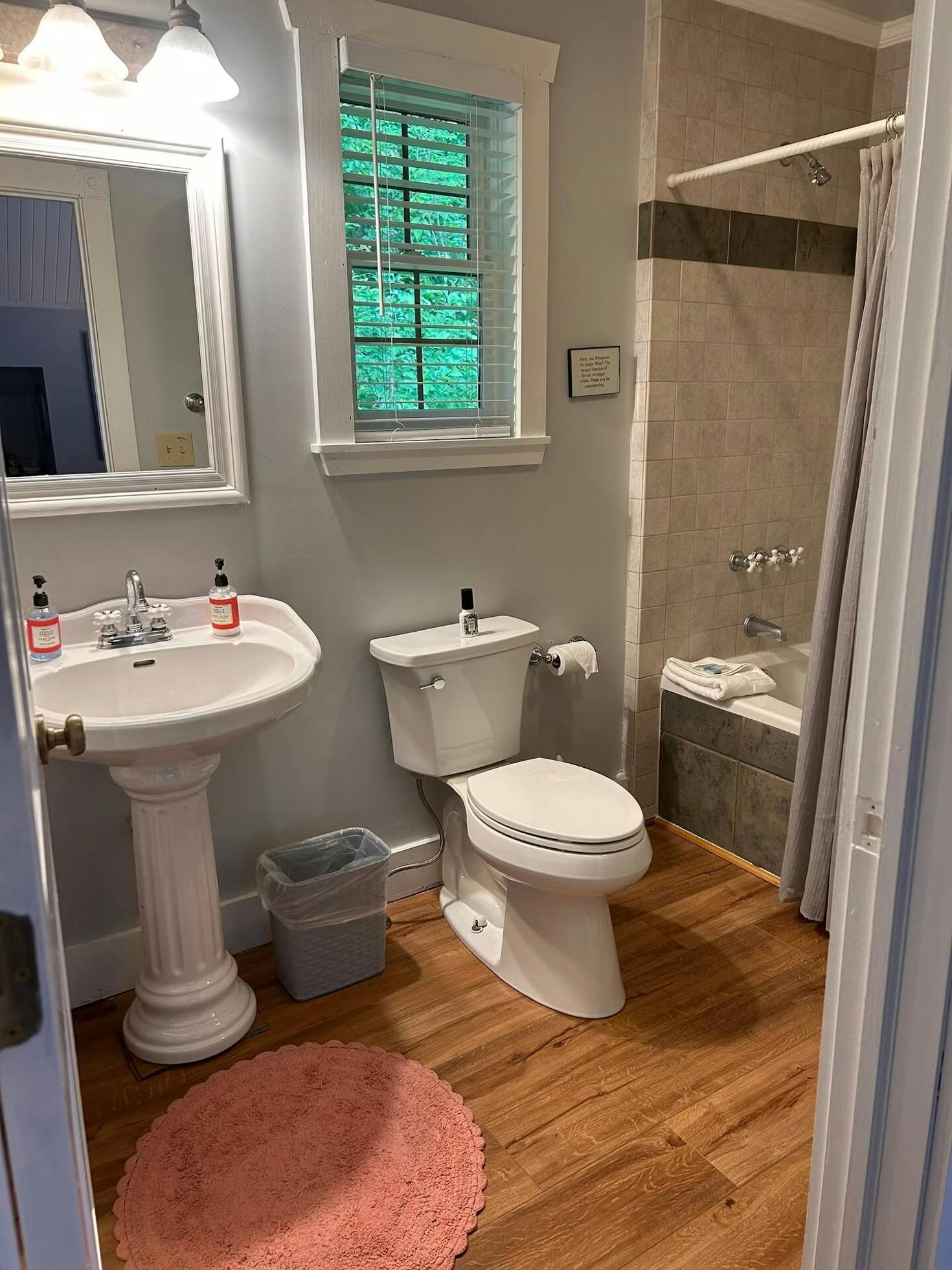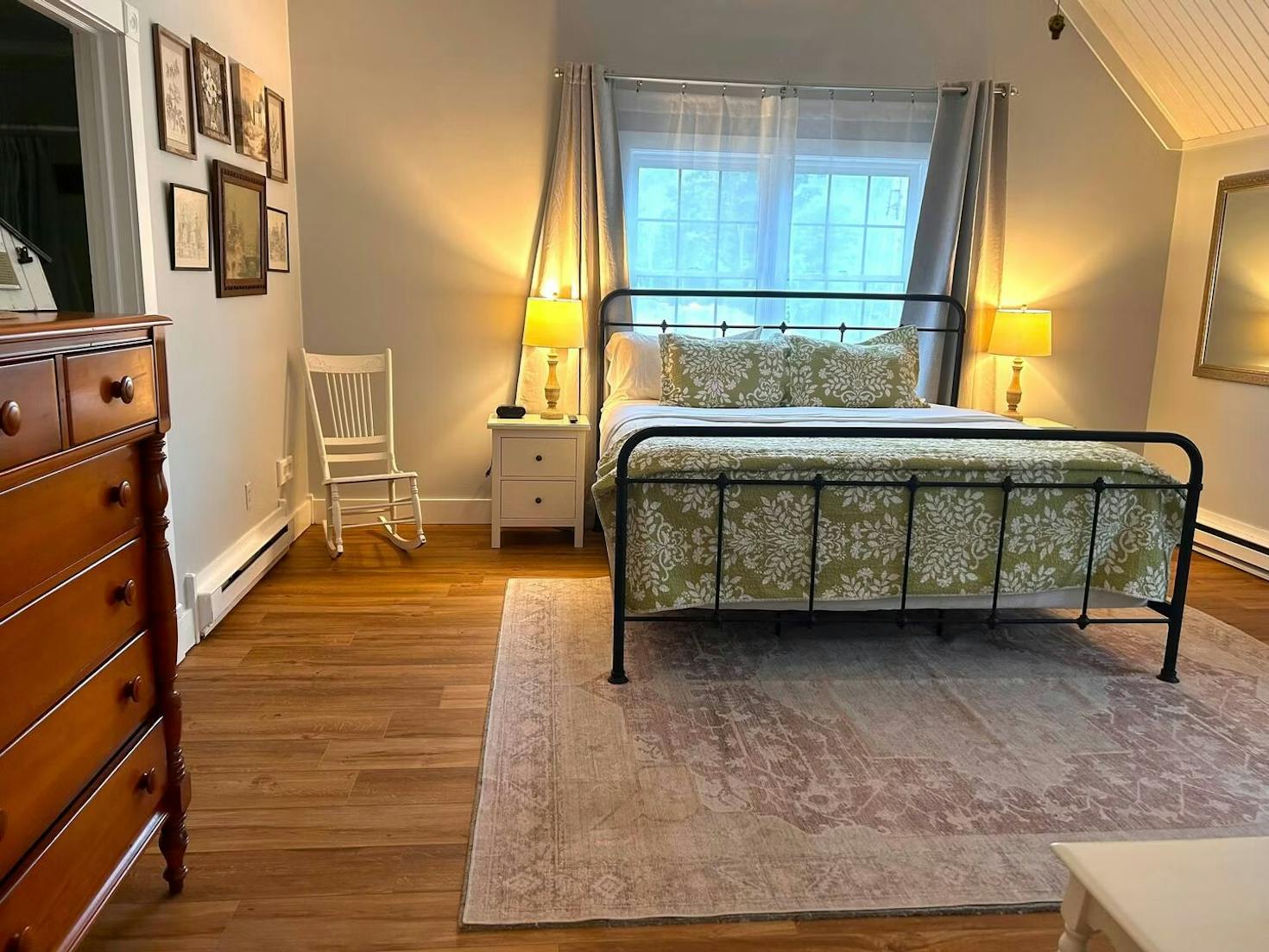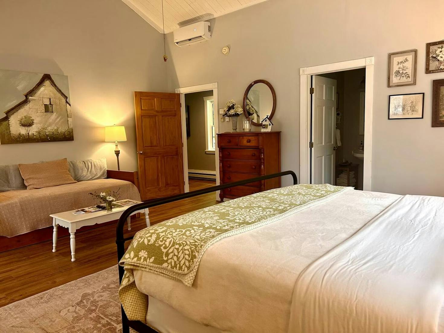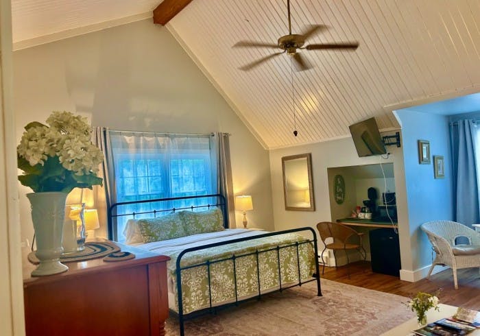 Large Room with King sized bed and double sized Futon. Spacious bathroom with Bath and Shower combo. Room includes dining table, Small refrigerator, coffee maker and microwave. Includes cable TV and high speed wired internet. Room sleeps up to four people.