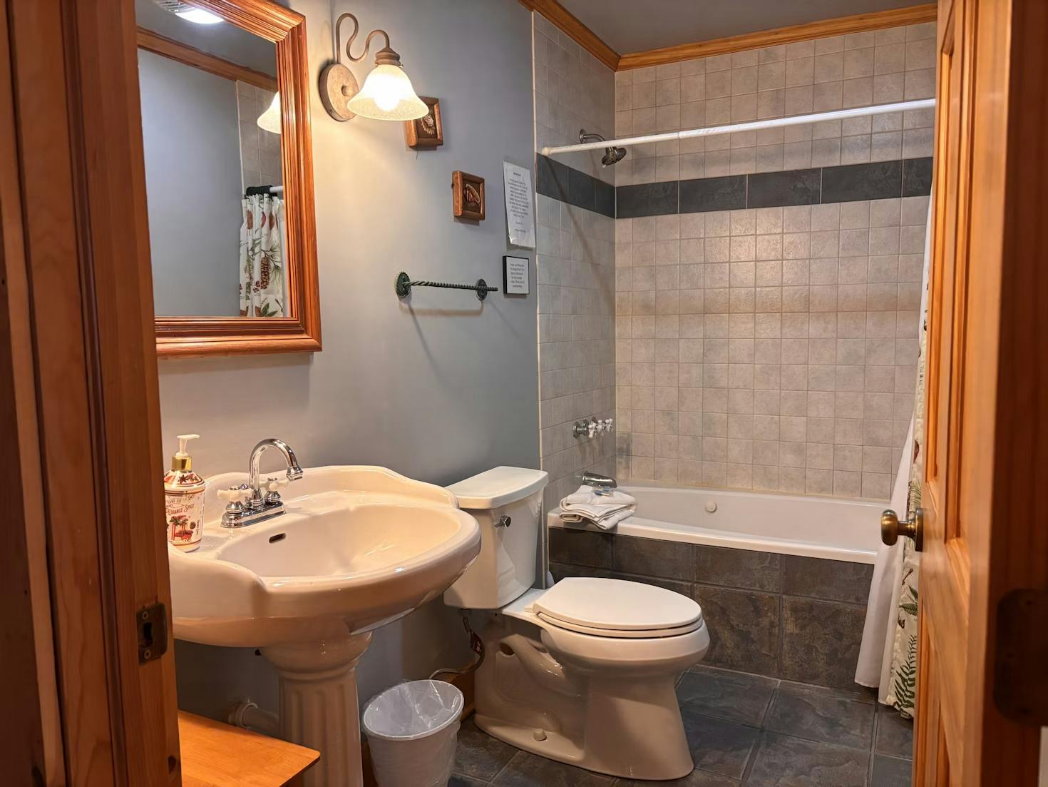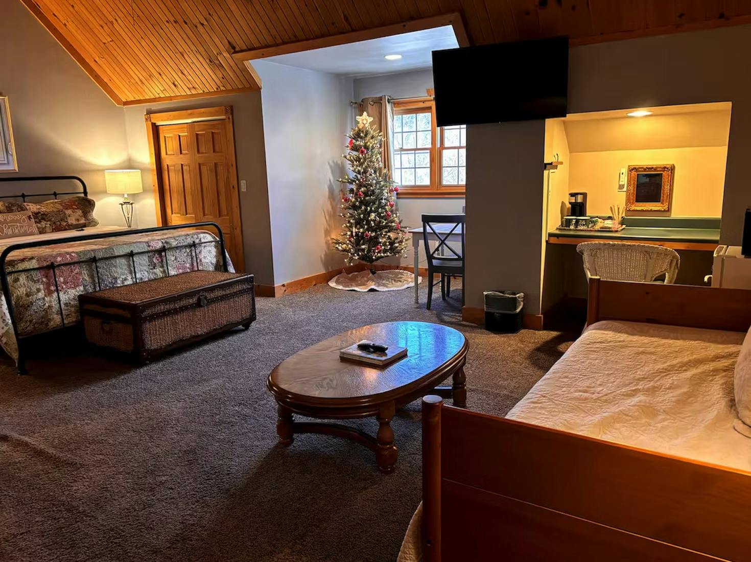 King size bed and a day bed with two twin mattresses. Located upstairs. Private bathroom includes bath and shower combo. Room includes coffee maker, small refrigerator and coffee maker. Room includes Cable TV and High Speed Wired Internet.